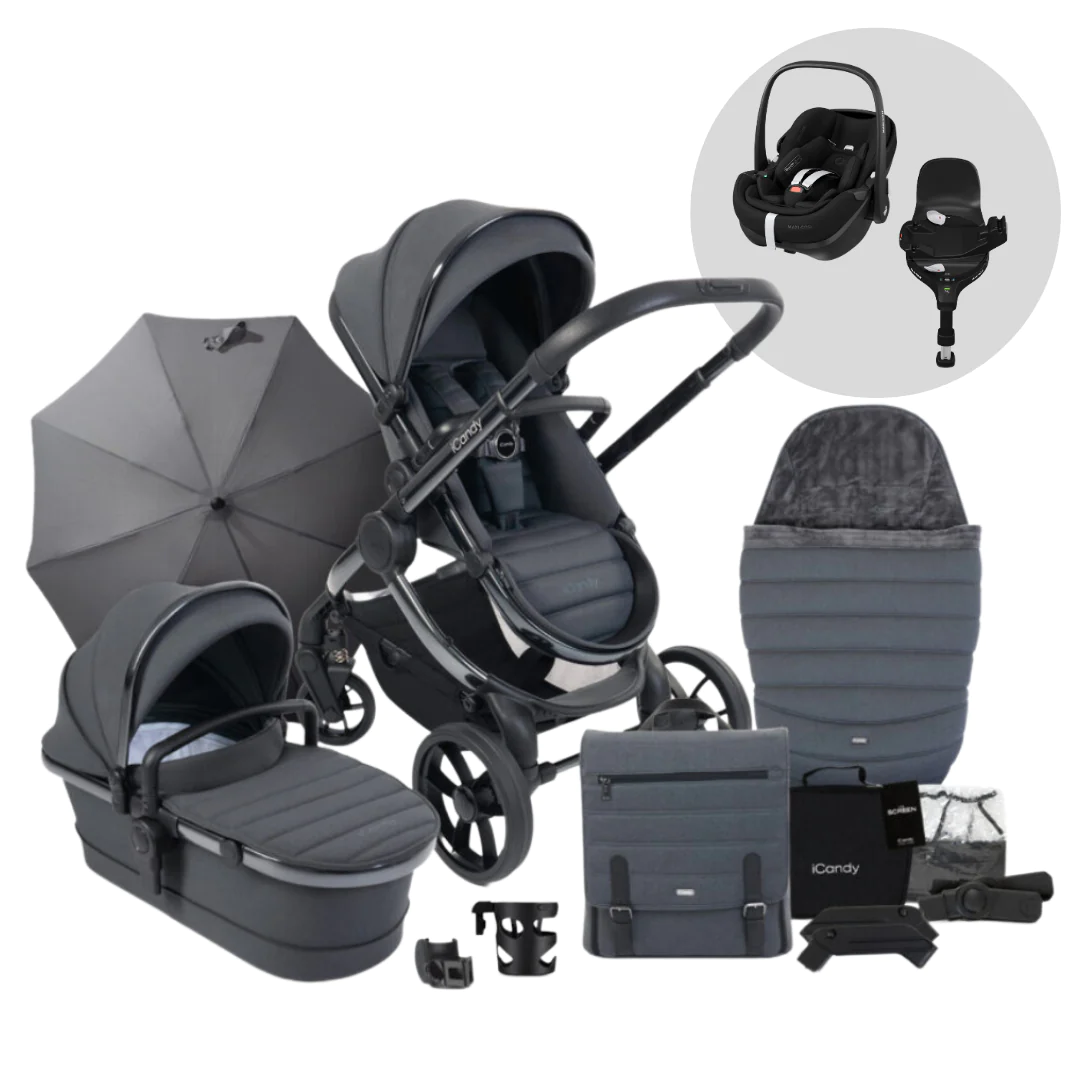 The ultimate pushchair for first time parents, the NEW iCandy Peach 7 & Maxi Cosi Pebble 360 Pro travel system in Dark Grey on a Phantom Chassis is beautifully engineered, suitable from birth due to the spacious carrycot which can also be used for permanent overnight sleeping. With its soft, modern premium knitted jersey fabrics guarantee comfort for baby and style for parents.