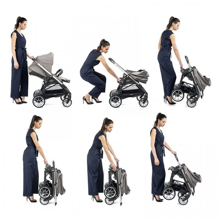 The stroller can be folded with the seat attached to the chassis, both forward and rear facing.